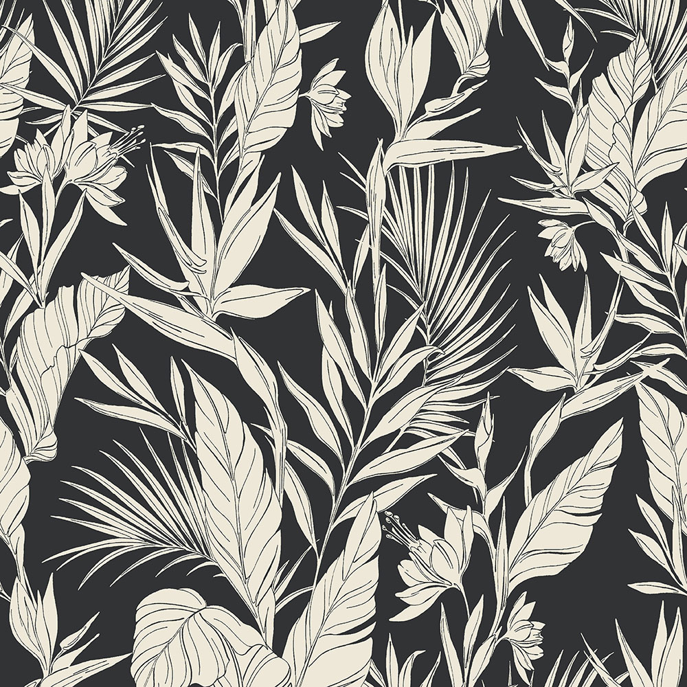 Matte black non-woven wallpaper, embossed glossy cream leaves.