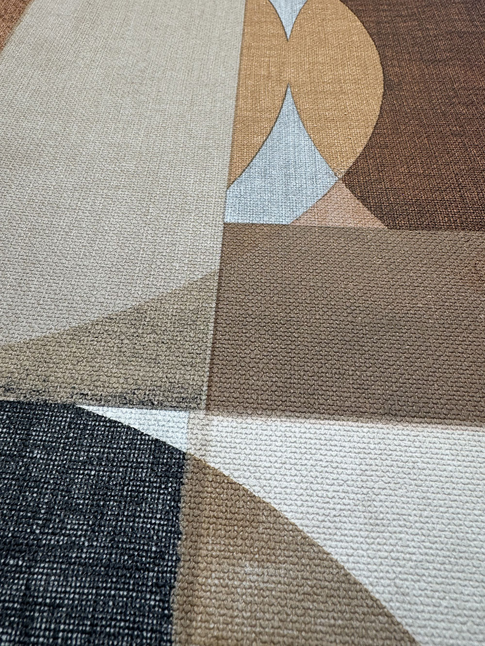 Geometric non-woven wallpaper, shades of brown and gray, fabric texture.