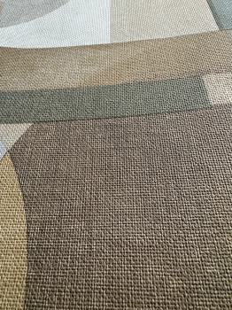 Geometrická vliesová tapeta, odstíny hnědé, zelené a šedé, látková textura.