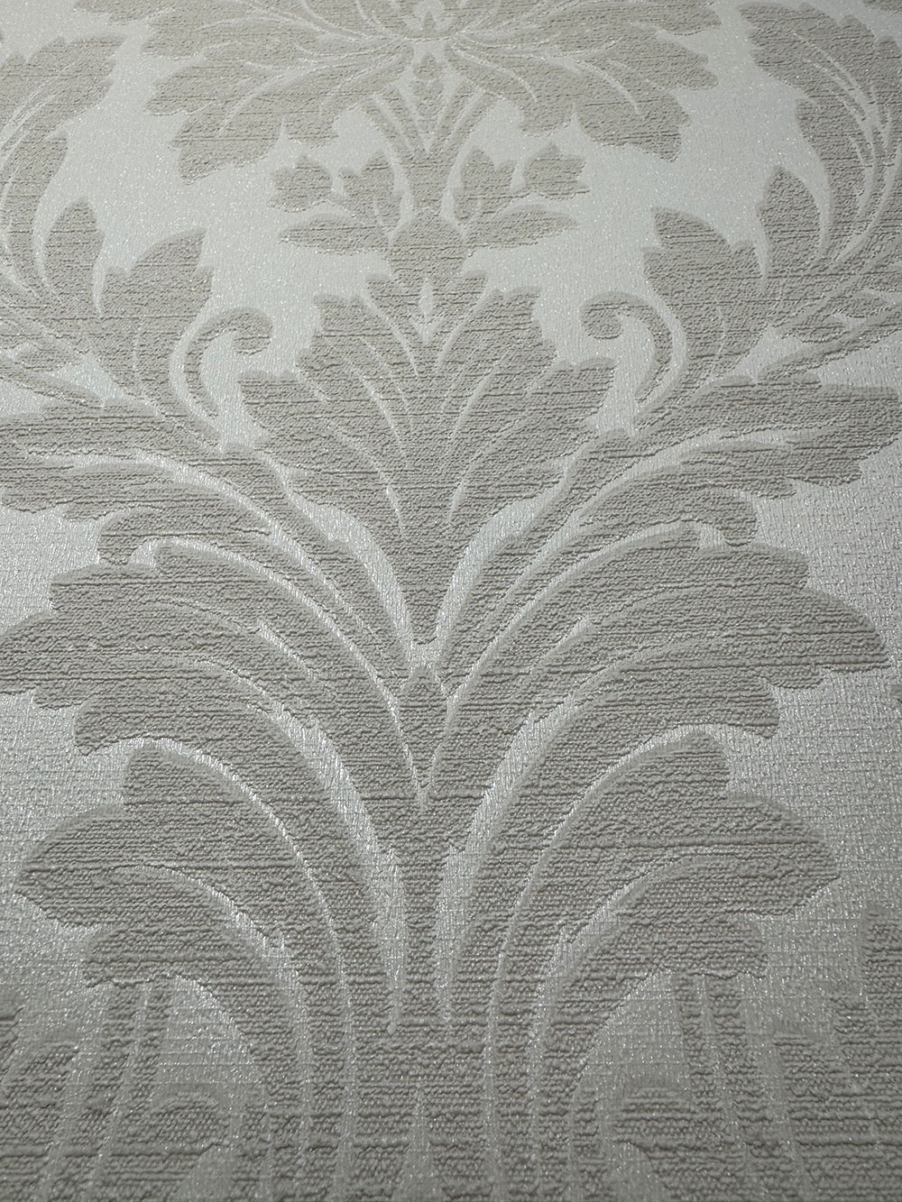 Non-woven wallpaper with baroque damask pattern, fabric texture. Semi-gloss background, pattern in taupe / grey-beige.