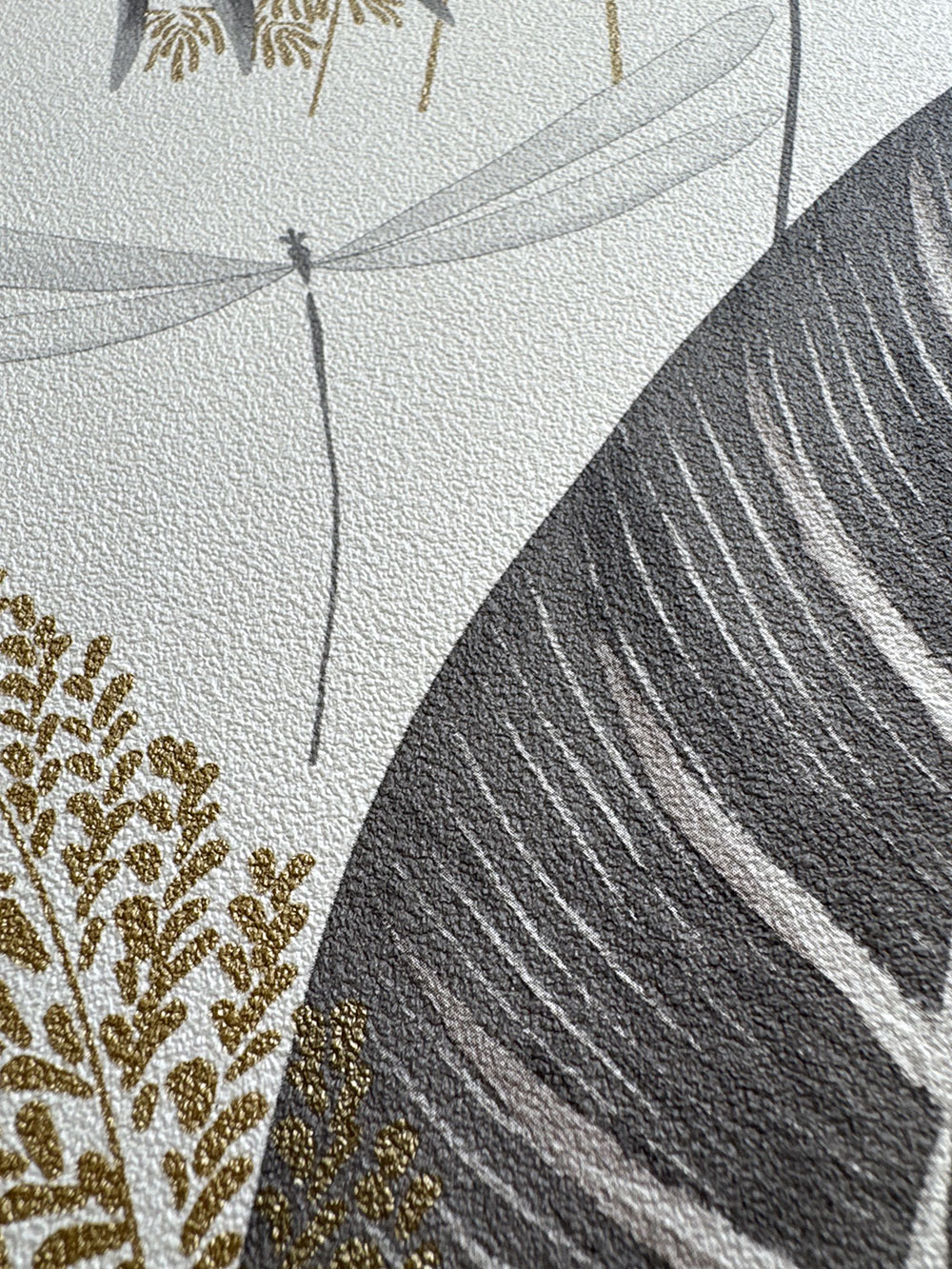Non-woven wallpaper, motifs of leaves in shades of gray and brown, dragonflies and golden grasses. Fine sand texture.
