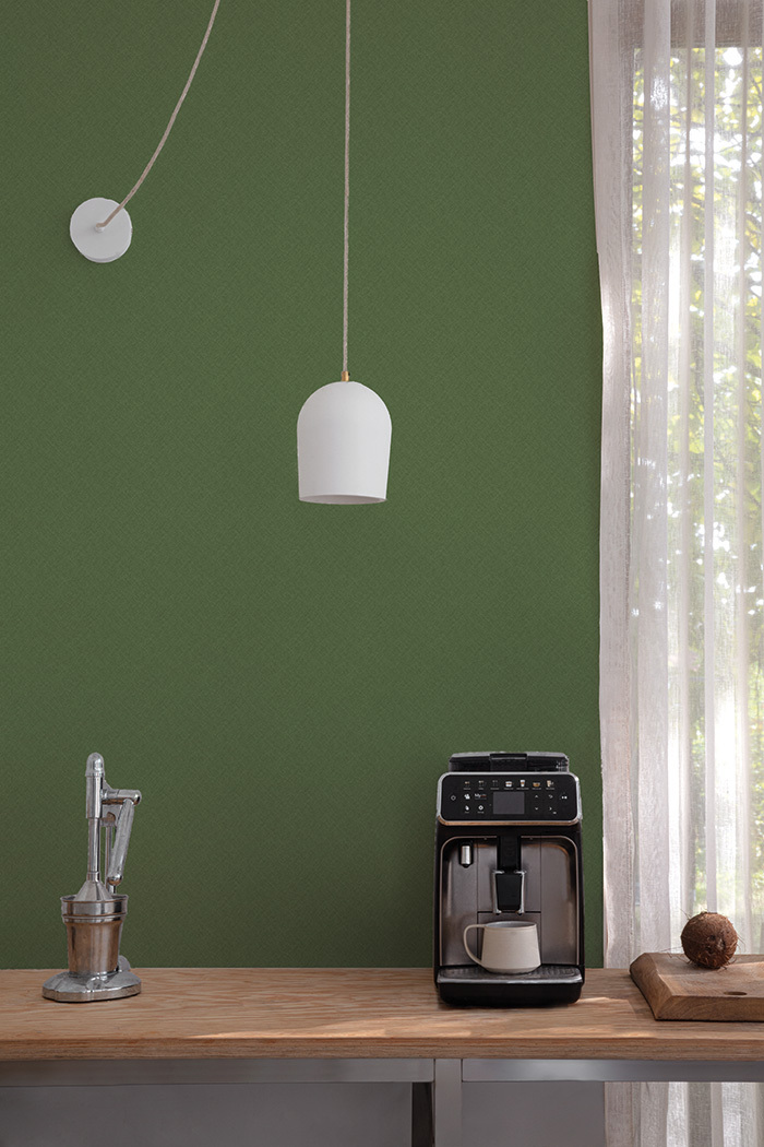 Finely textured non-woven wallpaper wallpaper, fabric imitation in green shades.