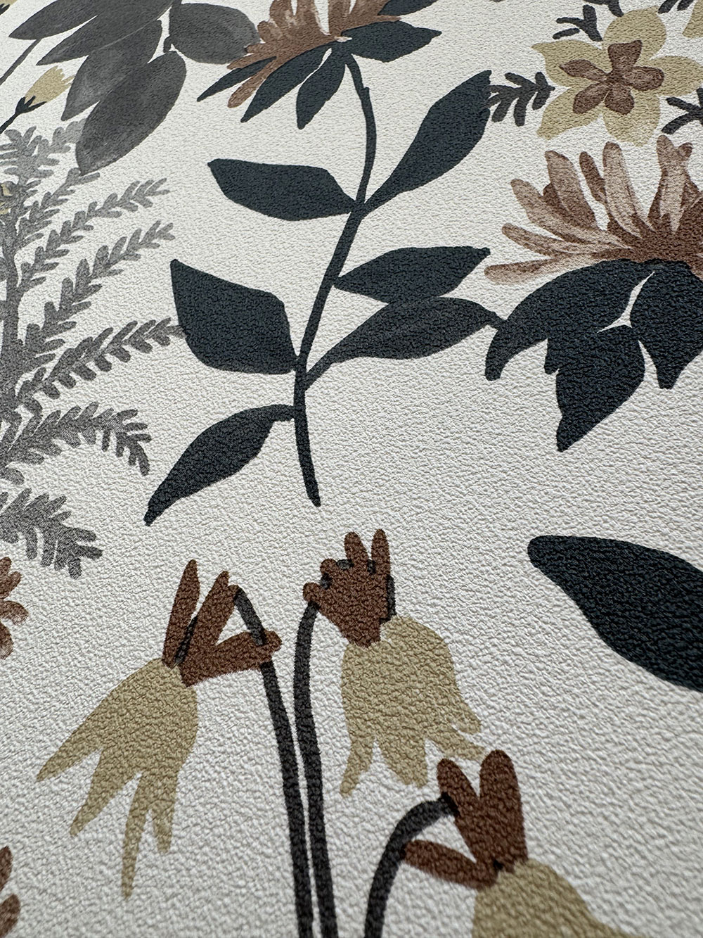 Non-woven wallpaper, flower motifs in gray and brown shades. Fine sand texture.