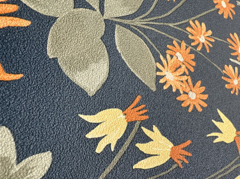 Dark blue non-woven wallpaper, flower motifs in green, brick orange and yellow shades. Fine sand texture.