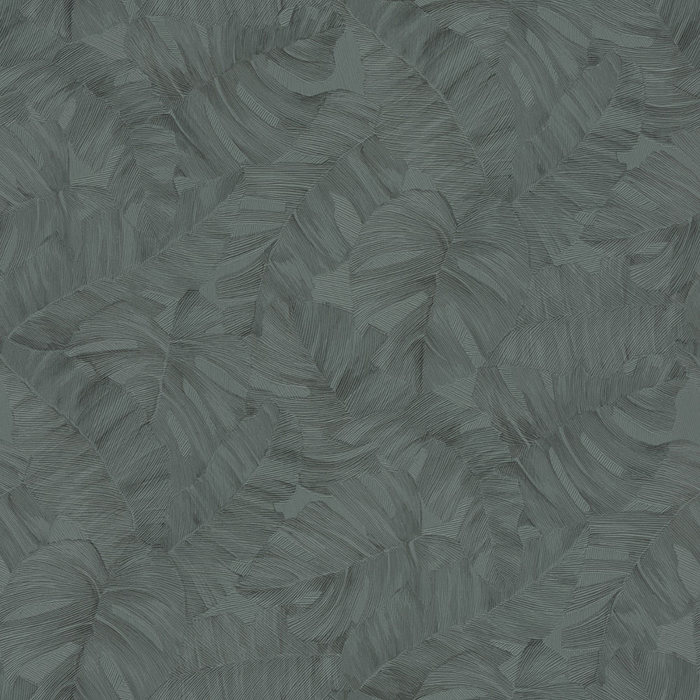 Embossed, green non-woven wallpaper, Monstera leaf motifs.