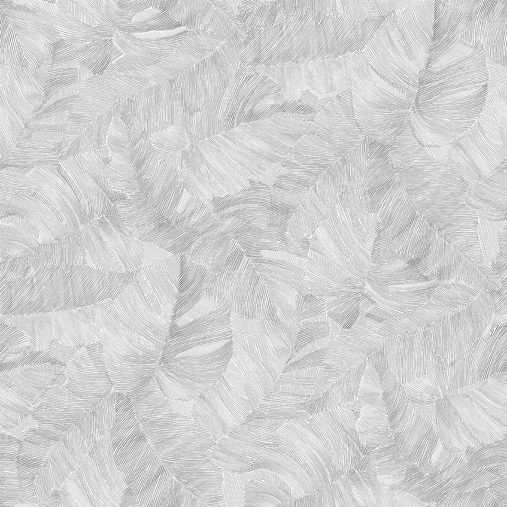 Embossed, white-gray non-woven wallpaper, Monstera leaf motifs.