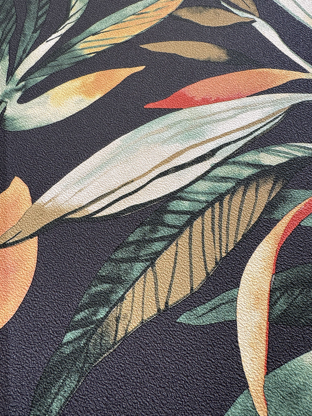 Black non-woven wallpaper, motifs of leaves in shades of green, brown and orange.