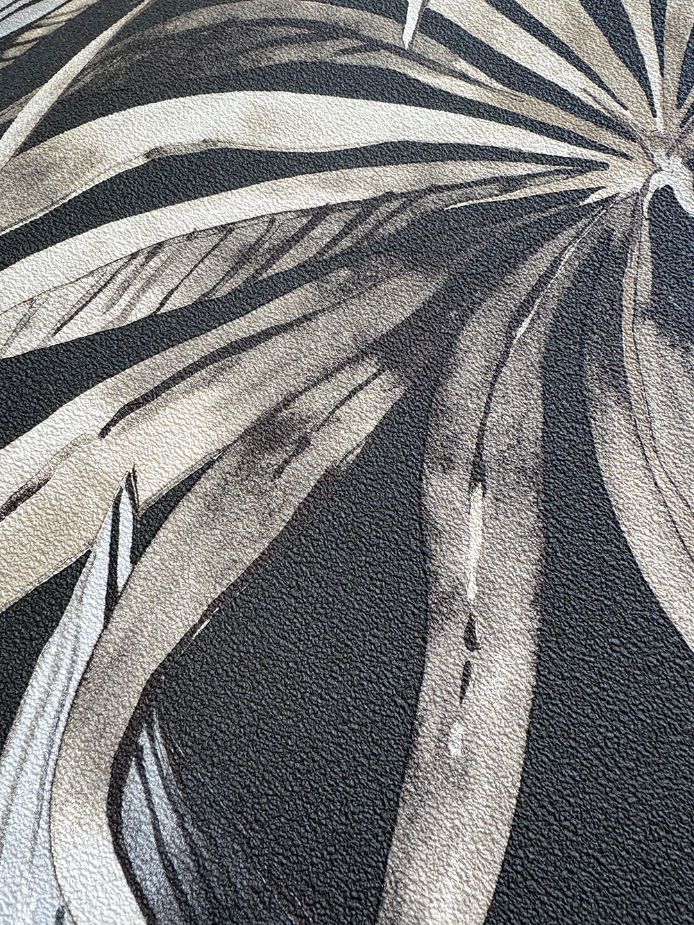 Black non-woven wallpaper, motifs of leaves in shades of brown and gray.