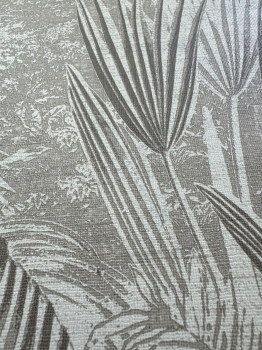 Non-woven wallpaper, motifs of leaves and palm trees in gray-beige shades.