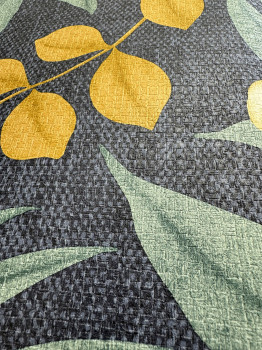 Blue non-woven wallpaper, branches and leaves in shades of turquoise and ocher, the appearance of a coarser textile.