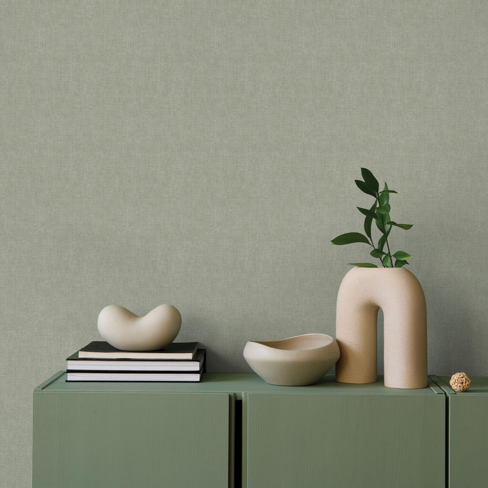 Green / sage / non-woven wallpaper, imitation of coarser fabric.