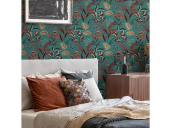 Turquoise non-woven wallpaper, leaves in shades of green, beige, brick red and burgundy, fabric texture.