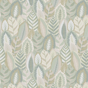 Blue-green-beige non-woven wallpaper, motifs of leaves, fabric texture.