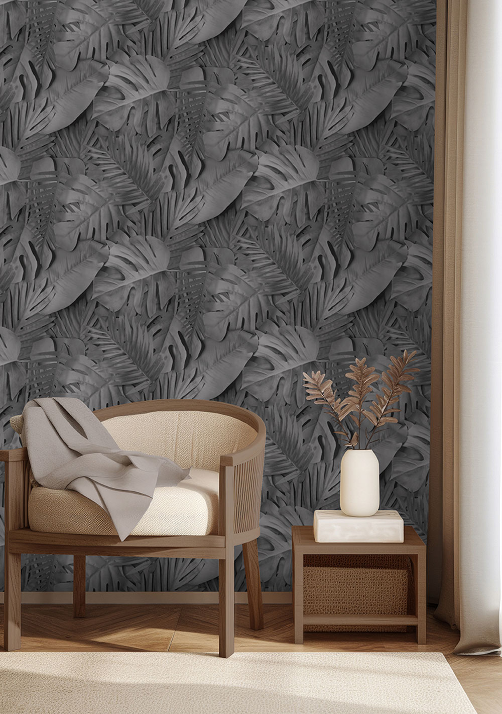 Non-woven wallpaper, tropical leaves in shades of black and grey.