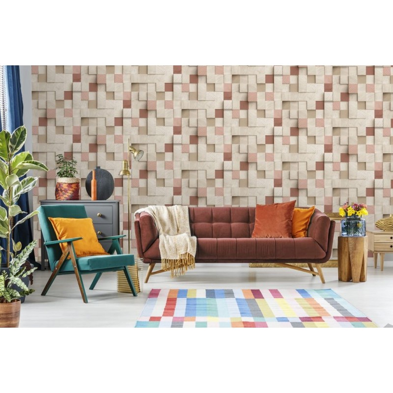 Non-woven wallpaper, 3D design of wood paneling in shades of beige, terracotta, pink.