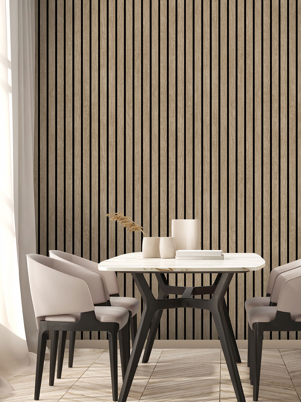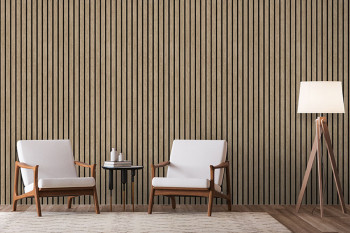 Non-woven wallpaper, 3D design of wood paneling, slats, boards.