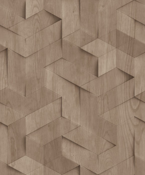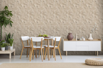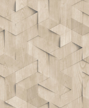 Non-woven wallpaper, 3D design of wood paneling in shades of cream and beige, fine texture.
