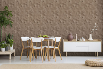 Non-woven wallpaper, 3D design of wood paneling in shades of brown, fine texture.