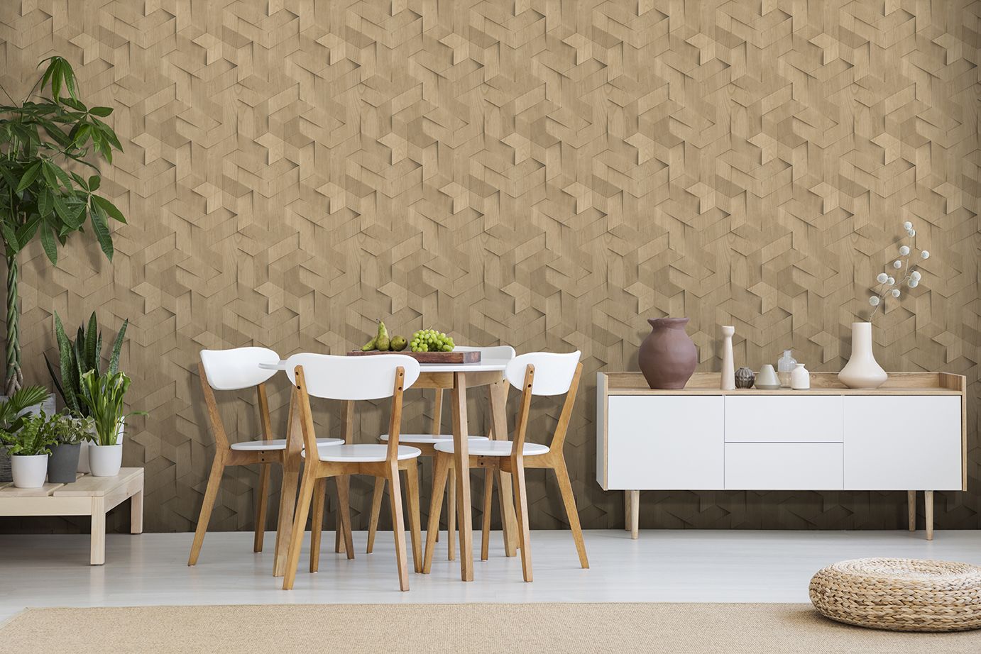 Non-woven wallpaper, 3D design of wood paneling in shades of beige, fine texture.