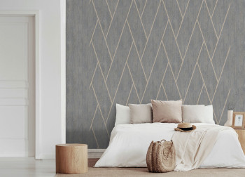Geometric non-woven wallpaper, in shades of gray, metallic lines, wood texture.