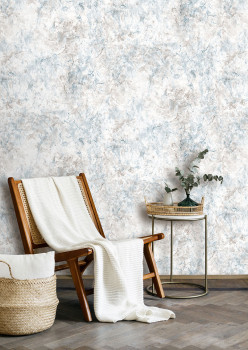 Non-woven wallpaper, marble decor in shades of blue and brown, fine texture.