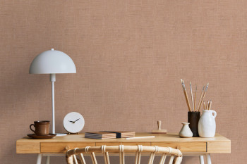 Non-woven wallpaper with vinyl surface, design evoking natural materials in brown/terracotta with a soft, metallic silver semi-gloss.