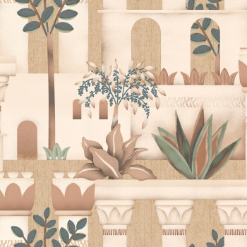 Non-woven wallpaper with vinyl surface, fine texture, succulents and Mediterranean buildings in shades of brown, beige and green.