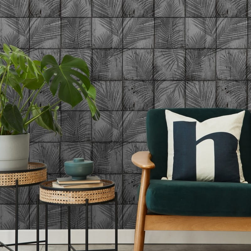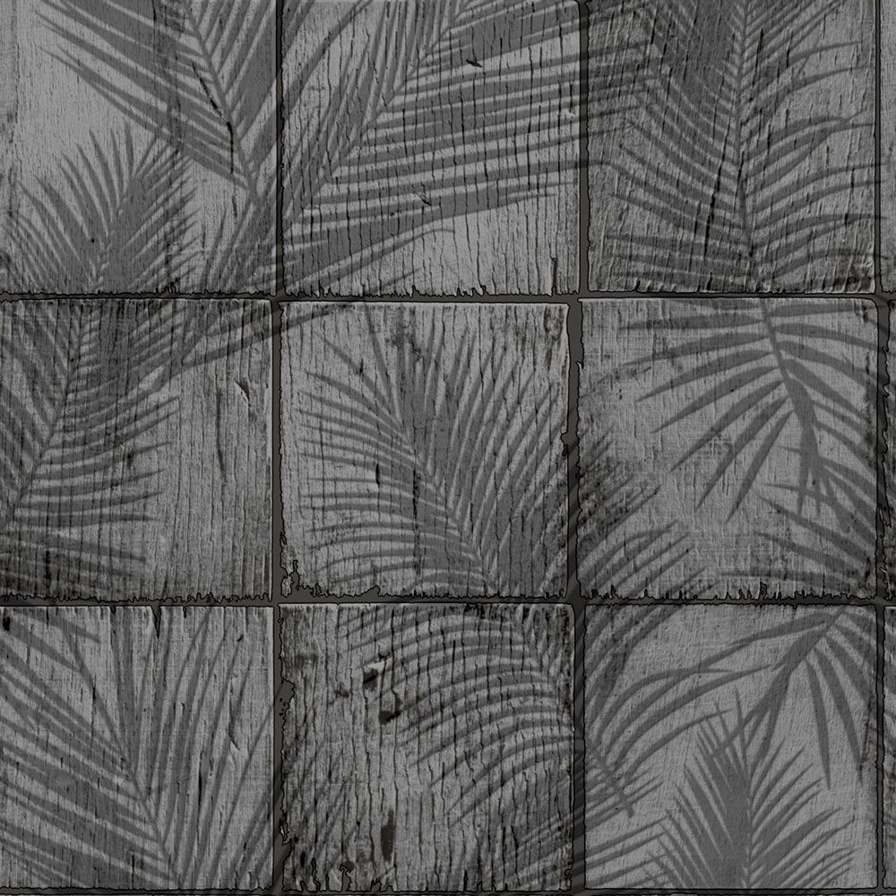 Grey-black non-woven wallpaper with vinyl surface, fine texture, wood paneling design with palm leaves.