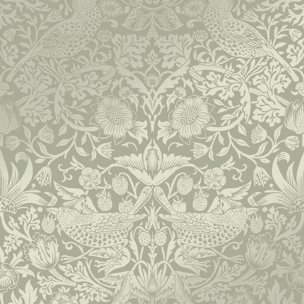 Non-woven wallpaper, rich ornamental pattern with flowers, leaves, birds and strawberries; sage green background, metallic, metallic shiny pattern.