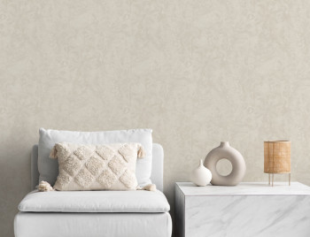 Gently embossed non-woven wallpaper with vinyl surface, imitation stucco plaster, shades of gray-beige, metallic semi-gloss.