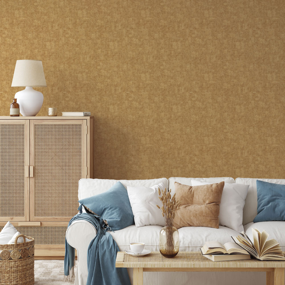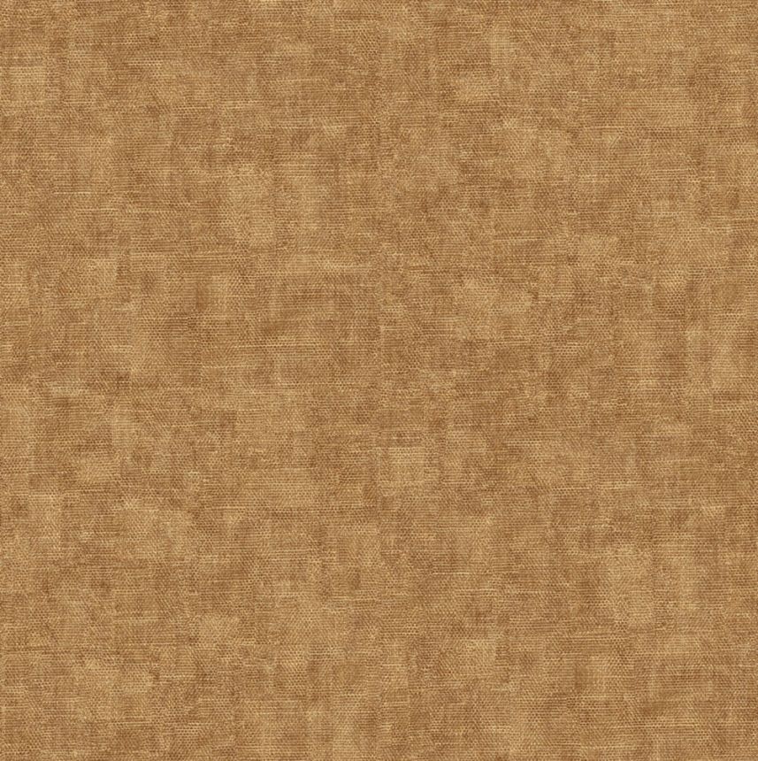 Gently embossed non-woven wallpaper with vinyl surface, imitation of a coarser fabric in shades of semi-glossy ocher-gold.