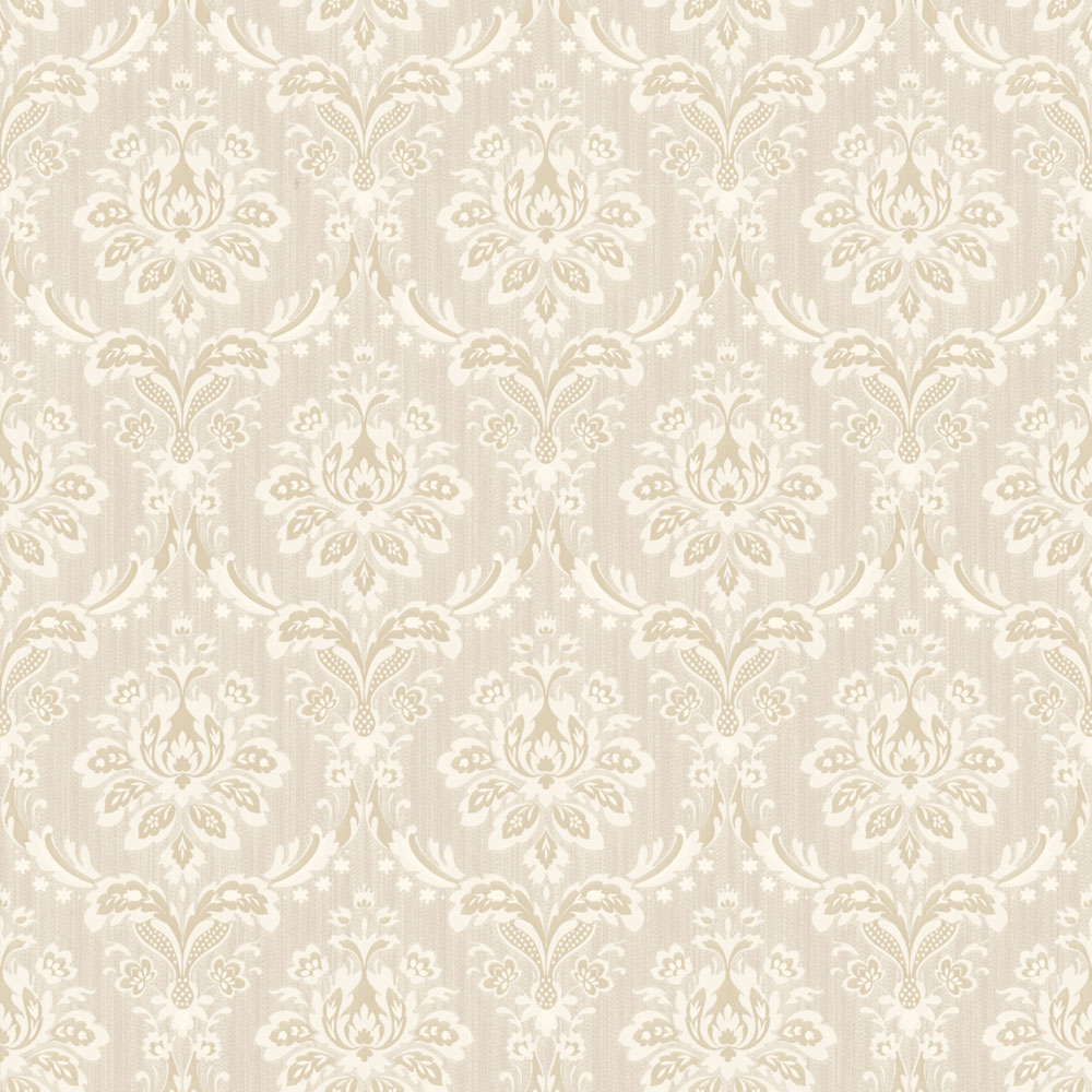 Gently embossed, semi-glossy non-woven wallpaper with vinyl surface, baroque pattern in shades of cream and beige.
