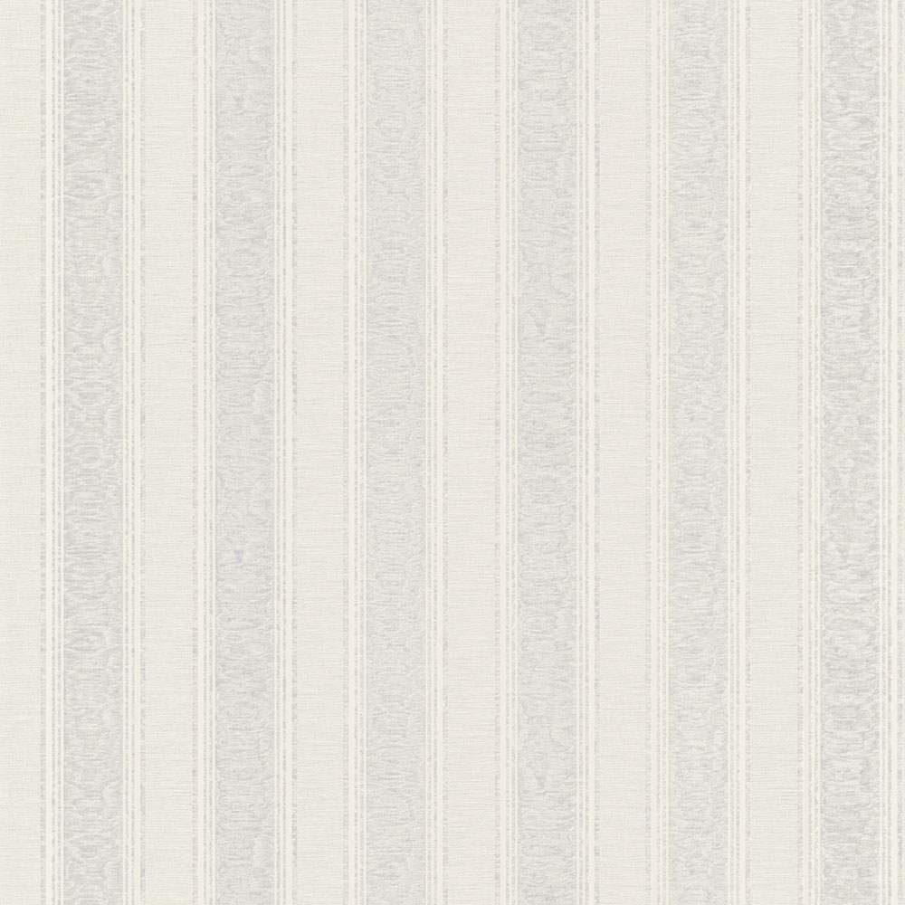 Gently embossed non-woven wallpaper with vinyl surface, stripes in shades of semi-gloss grey, cream and white.