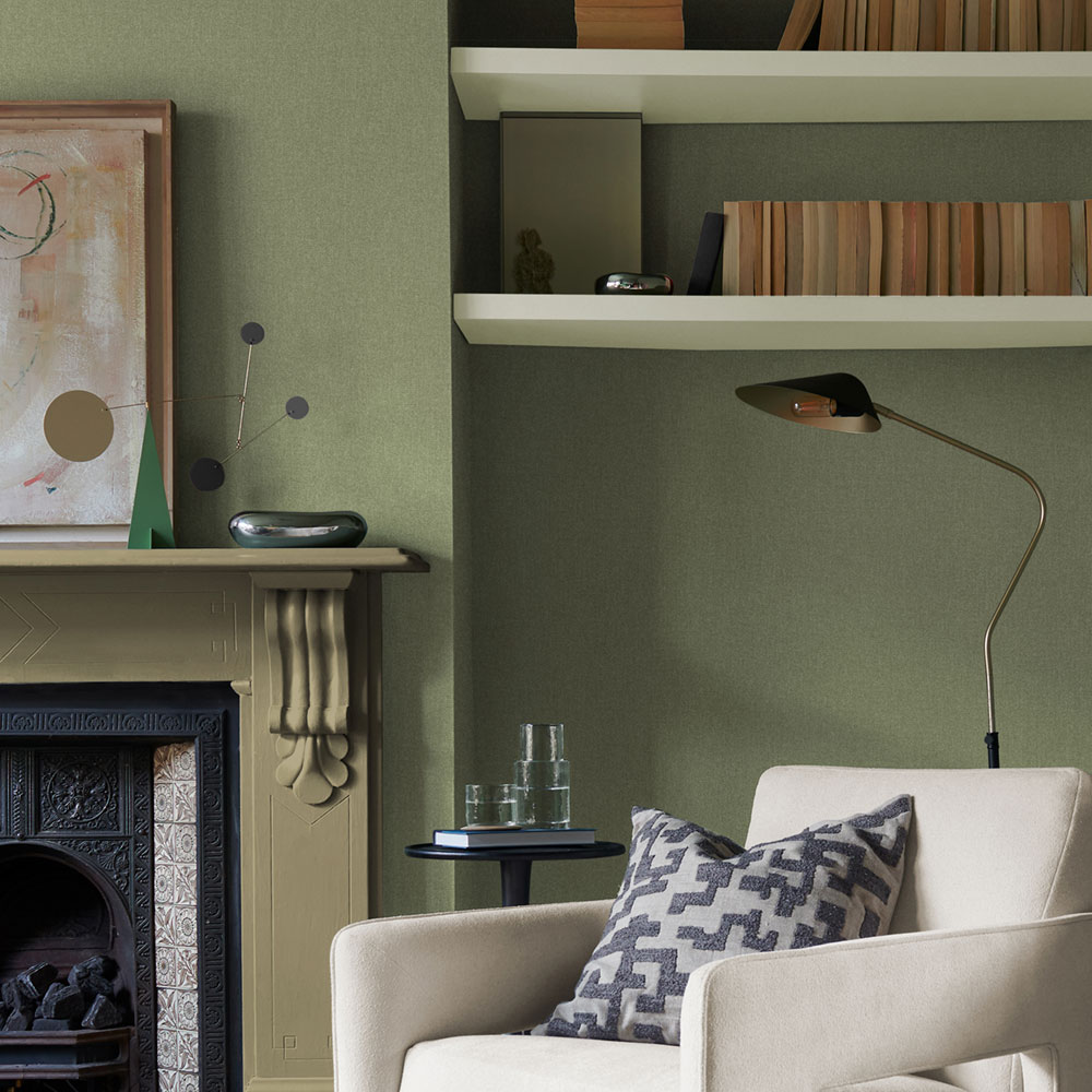 Smooth wallpaper, fabric-look design in shades of sage green.