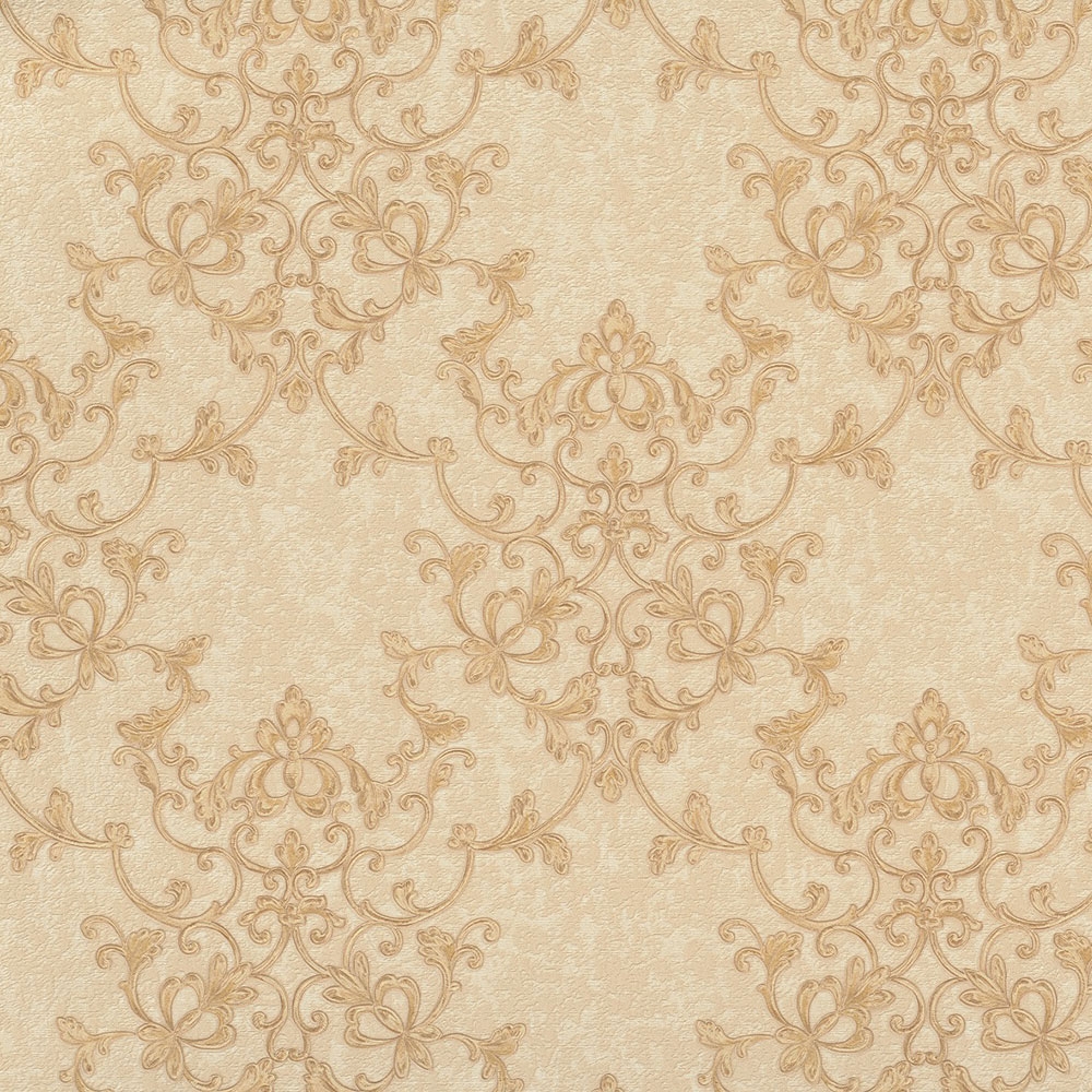 Bring an elegance and style into your interior. Venetian damask design. Gold-beige ornamental pattern on an ocher background. Can be easily combined with related patterns. Non.-woven backing, vinyl surface.