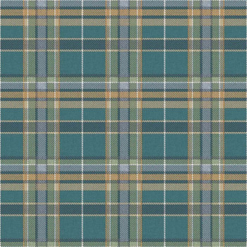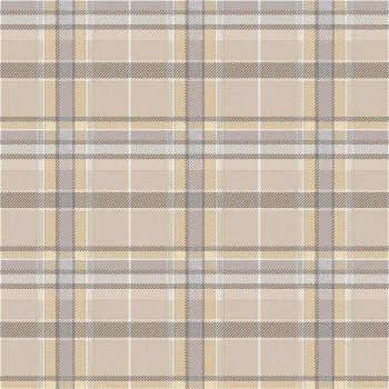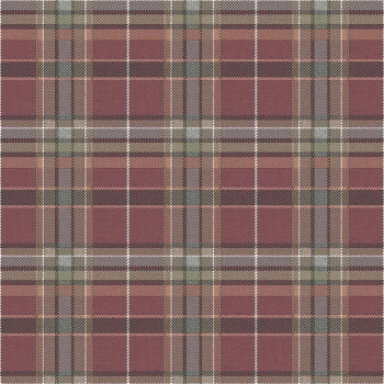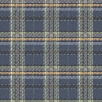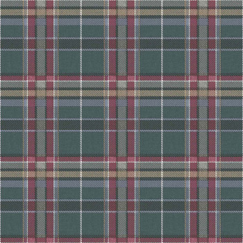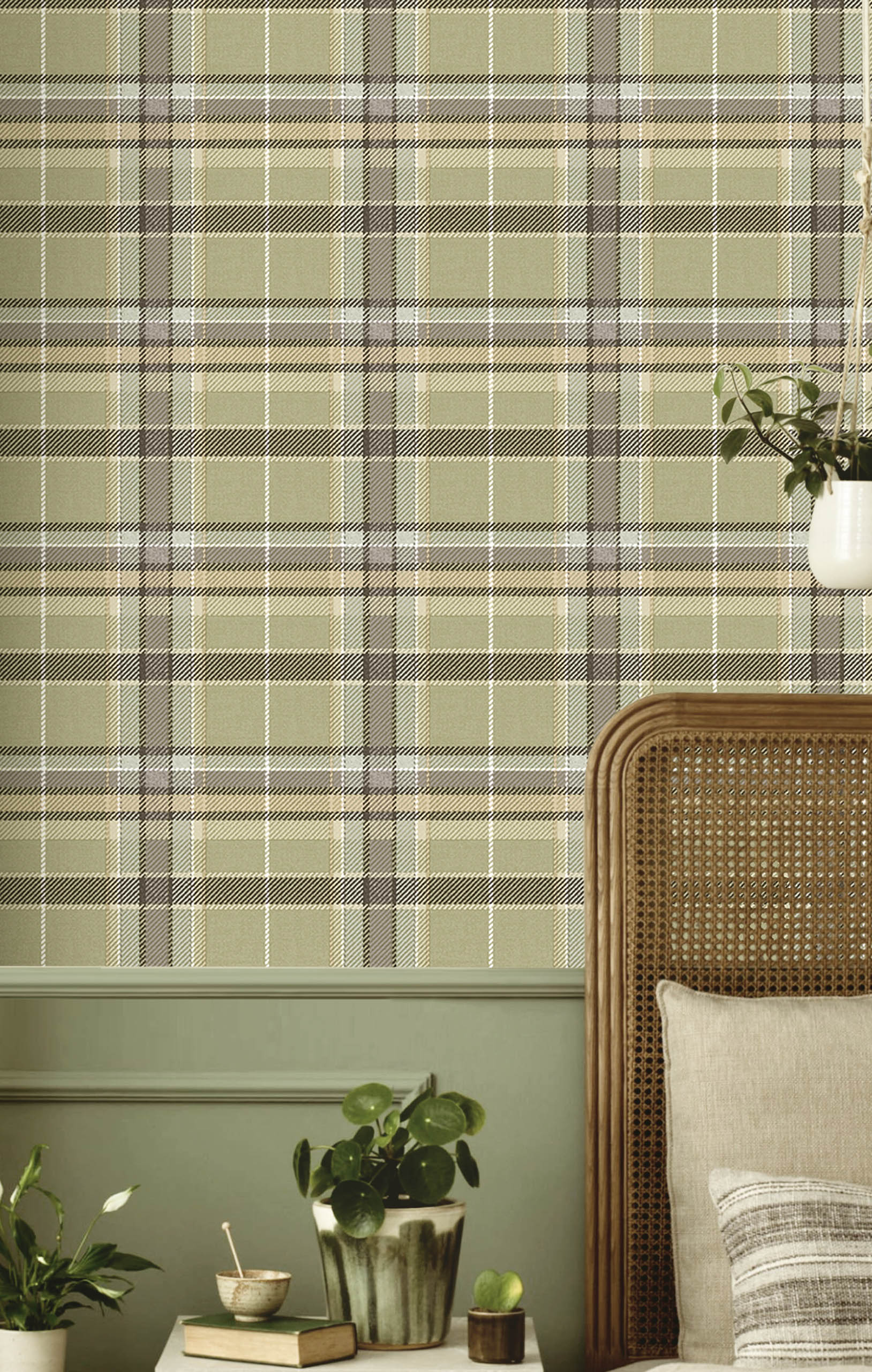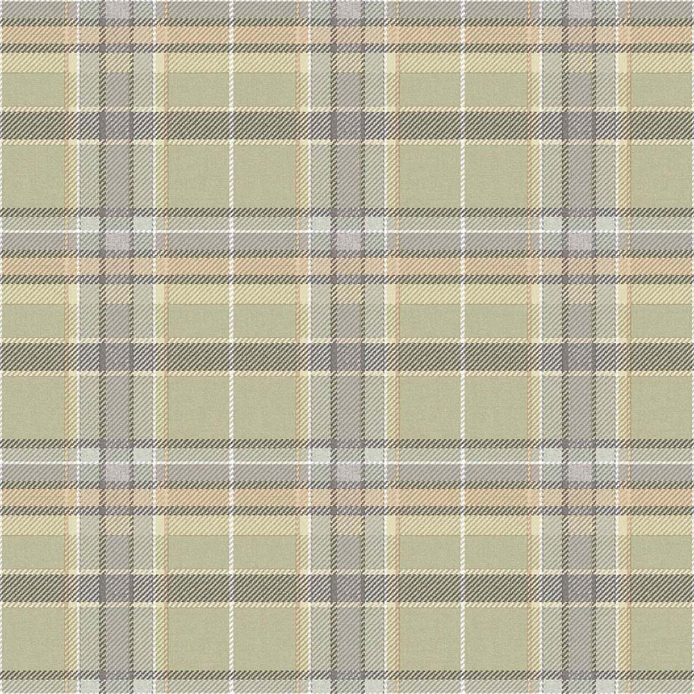 Non-woven wallpaper, imitation tartan fabric in shades of green, ochre and grey.