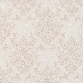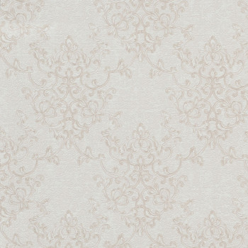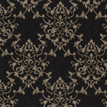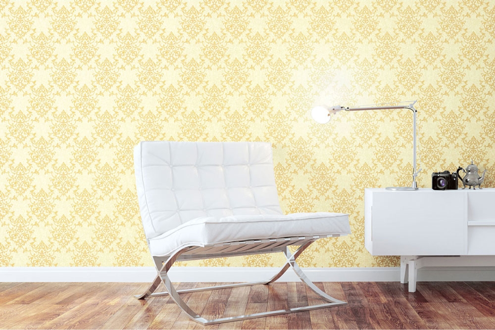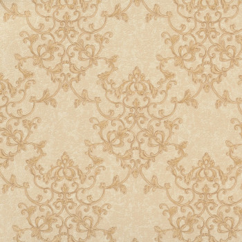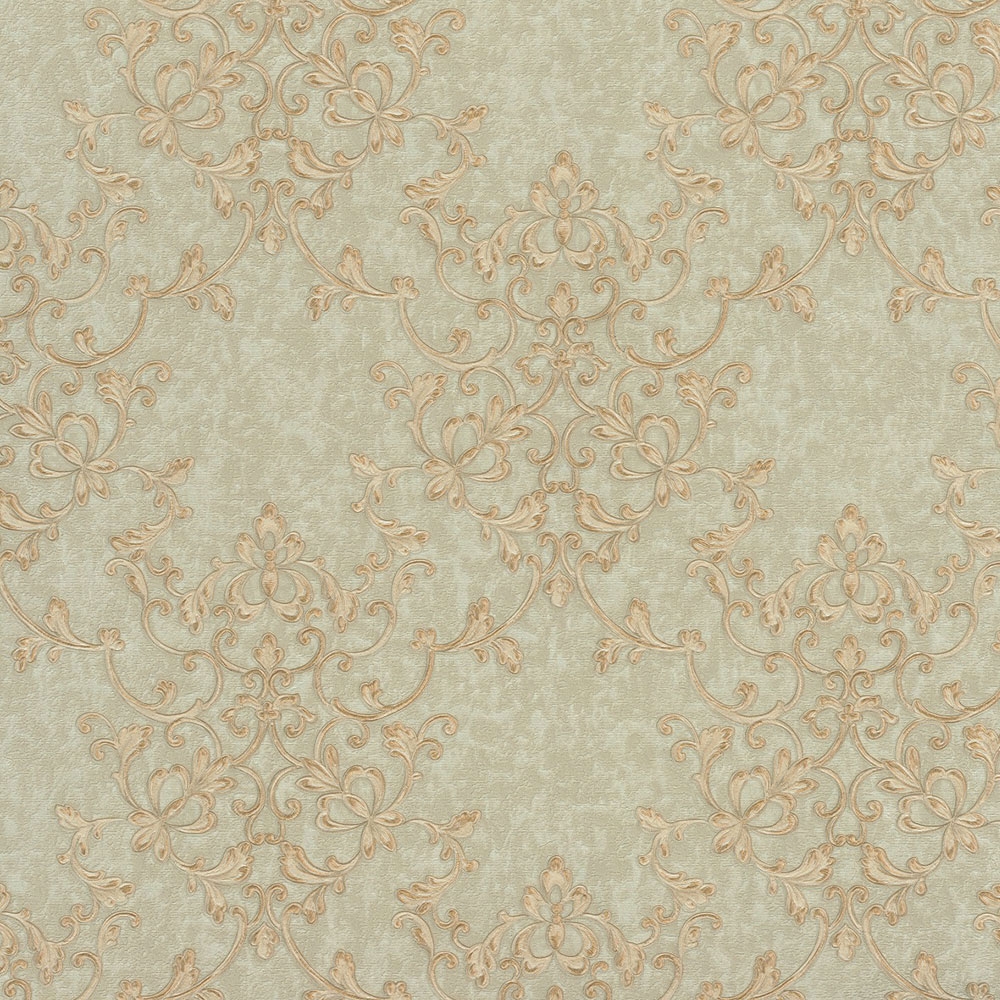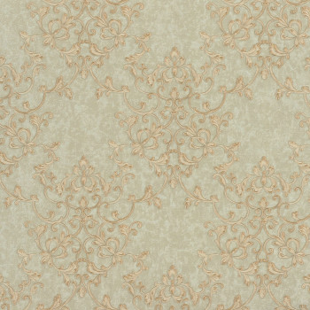 Venetian damask design brings an elegance and style into your interior.. Golden-beige ornamental pattern on a semi-glossy greenish background. Can be easily combined with related patterns. Non-woven backing, vinyl surface.