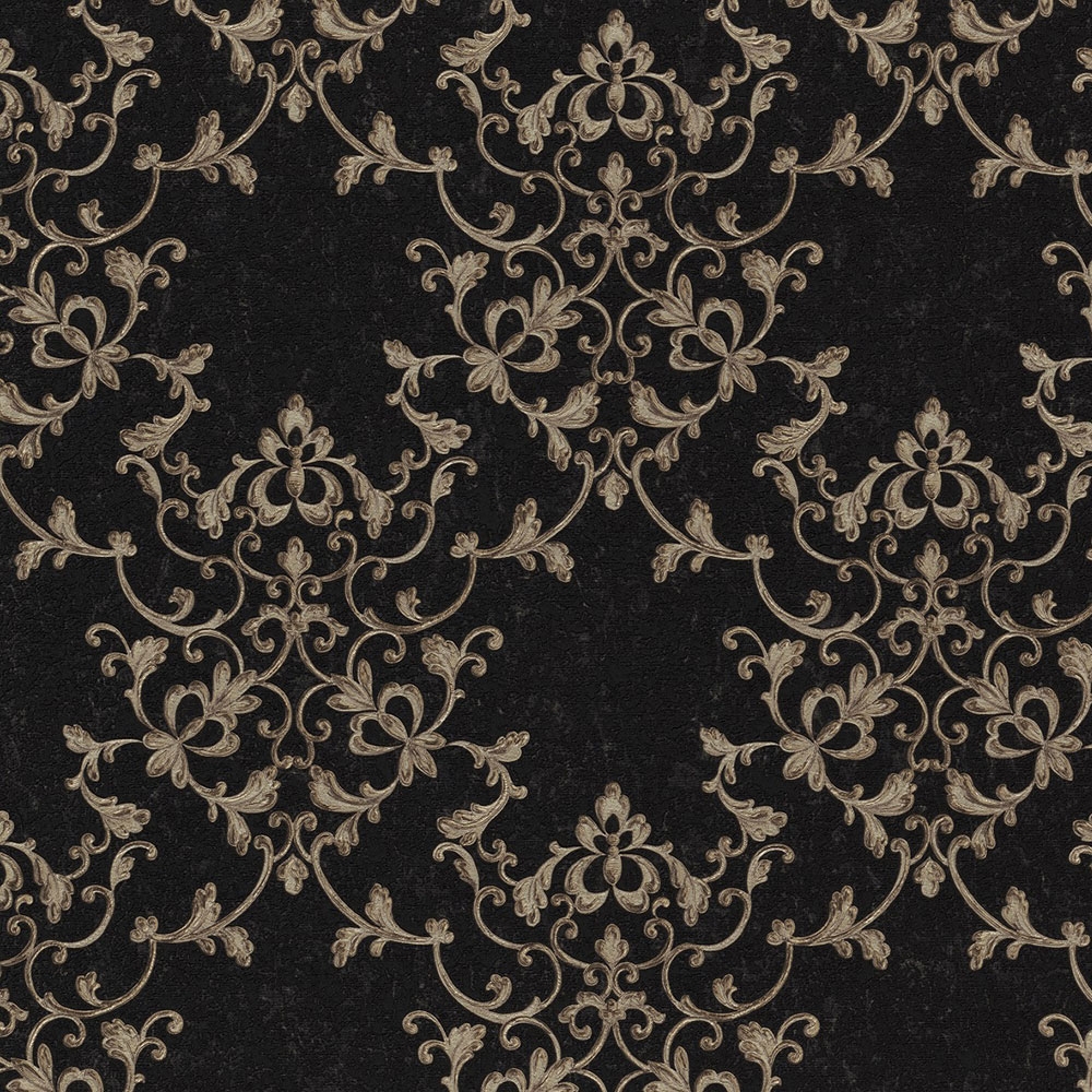 Venetian damask design brings an elegance and style into your interior.. Gold ornamental pattern on a black semi-glossy background. Can be easily combined with related patterns.