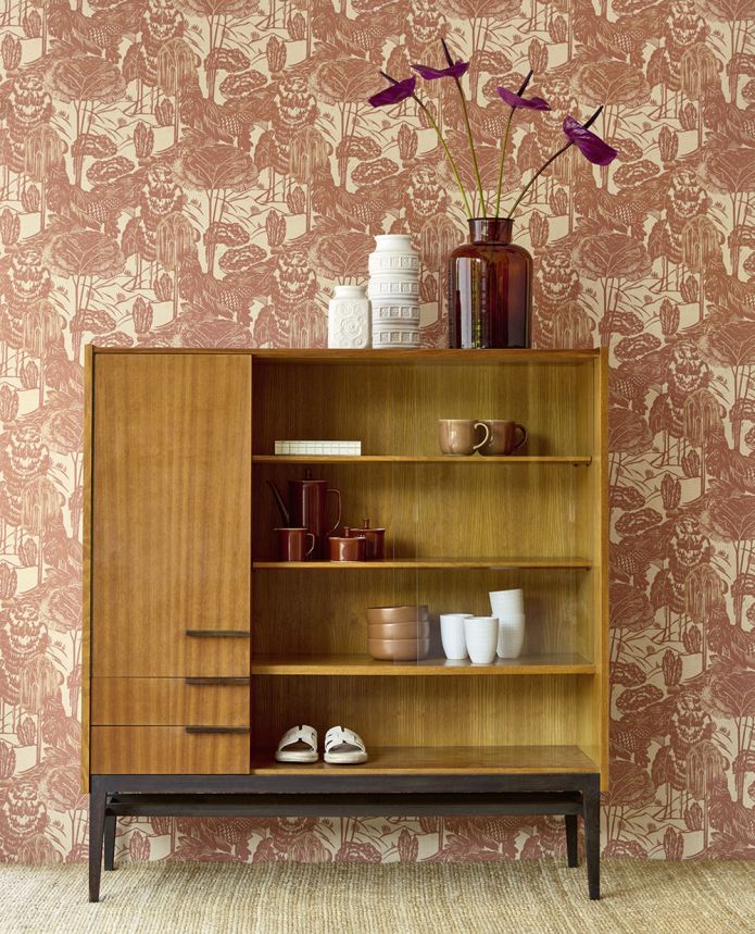 Non-woven wallpaper, leaf and tree motifs in shades of beige and brick red. Luxury retro wallpaper will create a playful atmosphere in your bedroom or living room.