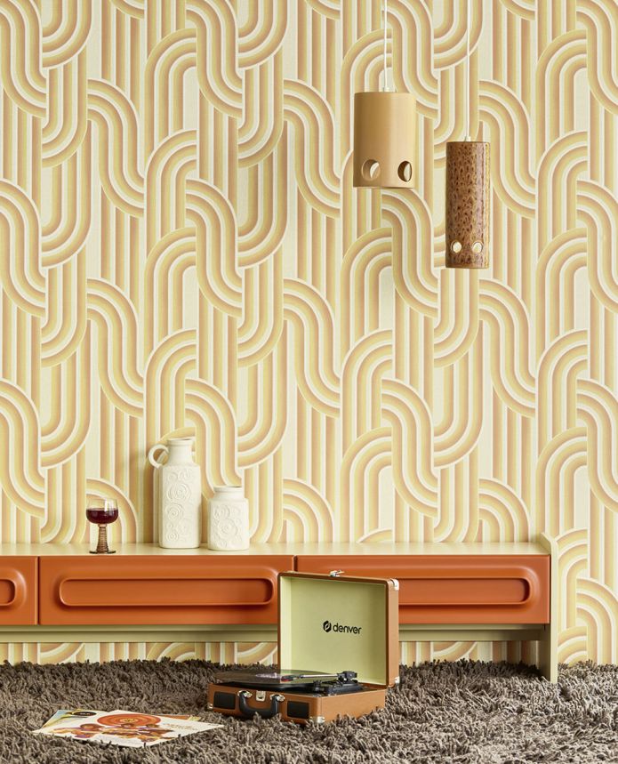 Non-woven wallpaper, graphic retro pattern in shades of orange and beige, fine texture. Luxury retro wallpaper will create a playful atmosphere in your bedroom or living room.