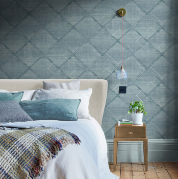 Non-woven wallpaper, geometric pattern in shades of matte blue, silver lines, delicately embossed texture.