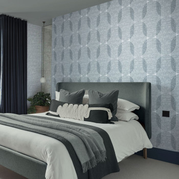 Non-woven wallpaper, graphic pattern, metallic semi-gloss, shades of blue.