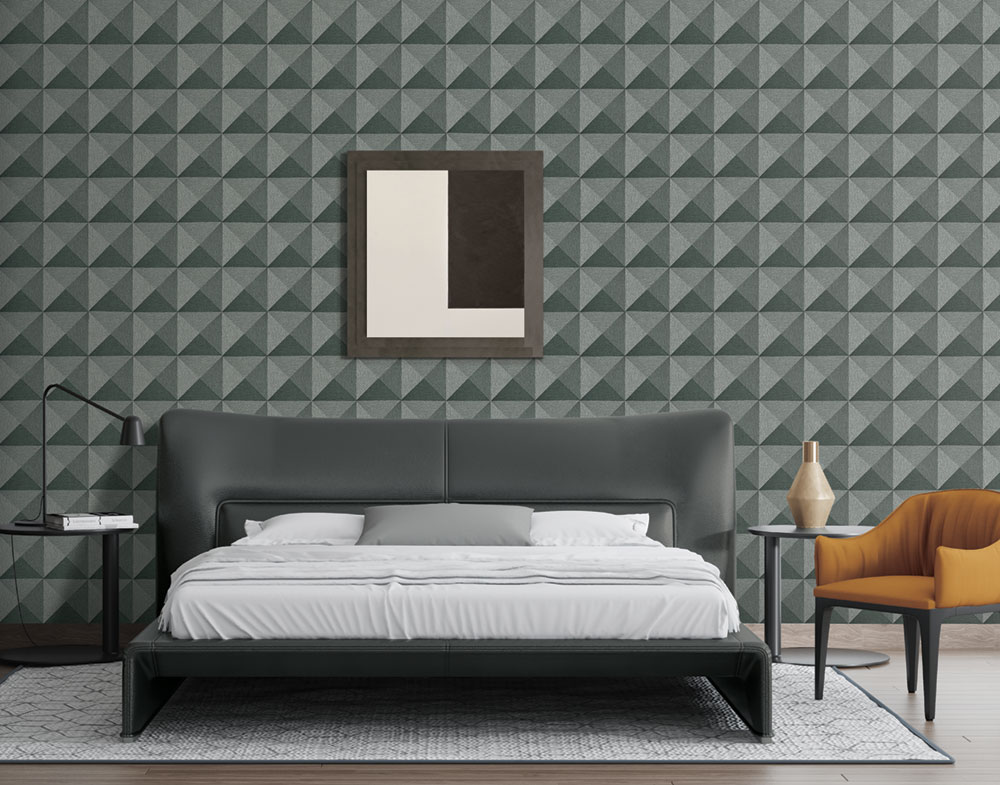 Non-woven wallpaper with vinyl surface, fine embossed texture, shades of gray, reflections and shades create a geometric pattern.