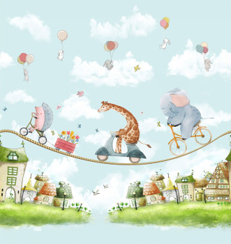 Non-woven wallpaper, children's motifs of traveling animals, light blue background.