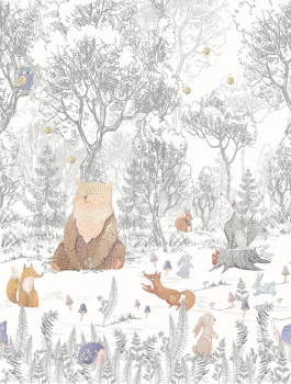 Non-woven wallpaper, forest animals motif, shades of grey, brown and blue.
