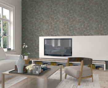 Unconventional geometric pattern in shades of a semi-glossy turquoise. Can be easily combined with related patterns. Non-woven backing, vinyl surface.