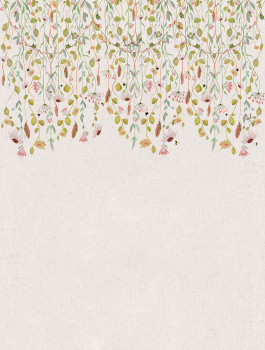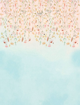 Non-woven wallpaper, motif of flowers, leaves and birds, shades of green, ochre and pink, blue background.