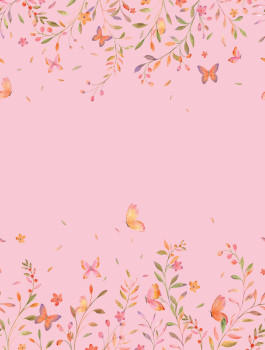 Non-woven wallpaper, flowers and butterflies motif, shades of pink, green, yellow and purple.