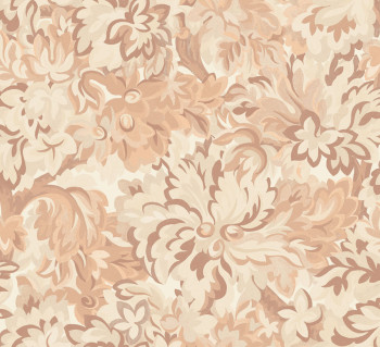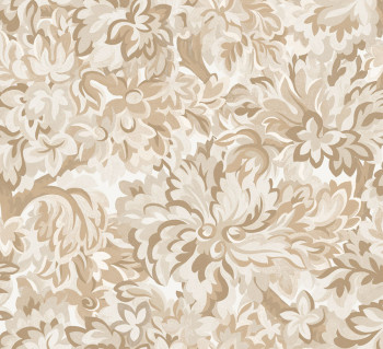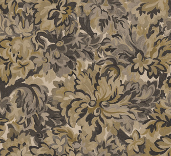 Smooth non-woven wallpaper, floral pattern in shades of brown, khaki, grey and black.