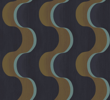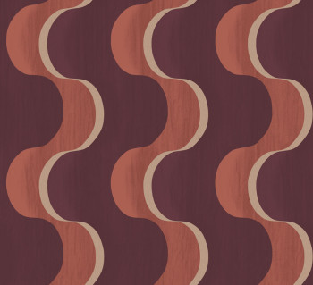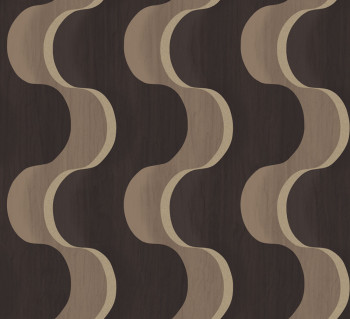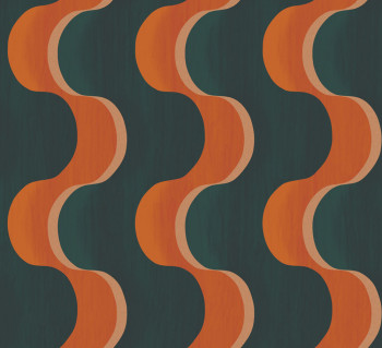 Smooth non-woven wallpaper, 3D wave effect in shades of matte dark green, brick brown-orange and semi-glossy golden-beige.